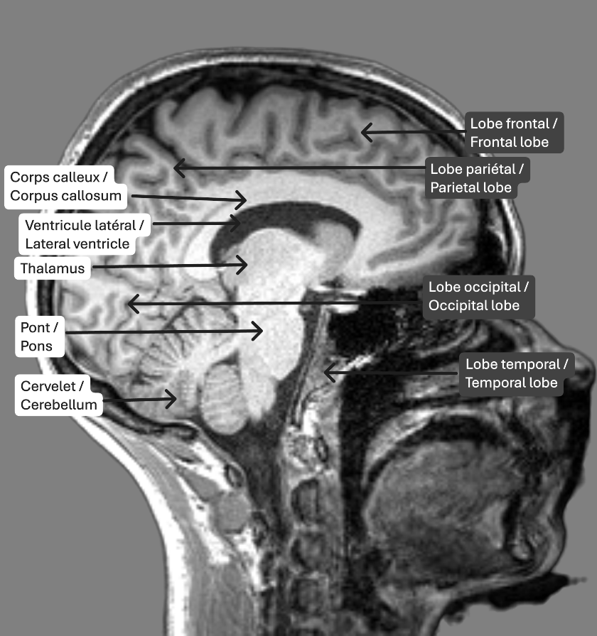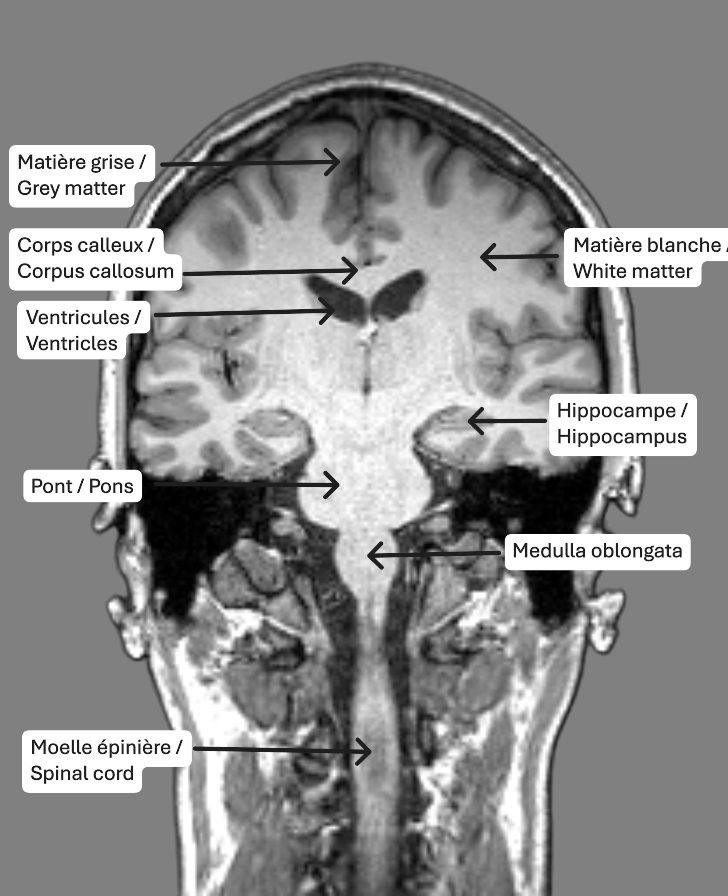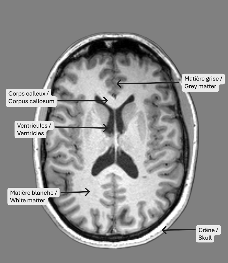Les tissus les plus facilement identifiables sur les images IRM pondérées en T1 sont les ventricules, la matière blanche et la matière grise. Les ventricules, en noir, sont des cavités contenant le liquide cérébrospinal, qui circule également dans les méninges. La matière blanche est constituée des axones des neurones et des connexions entre ceux-ci, et est représentée en gris pâle. En gris foncé, on retrouve la matière grise, qui comprend les corps cellulaires des neurones.