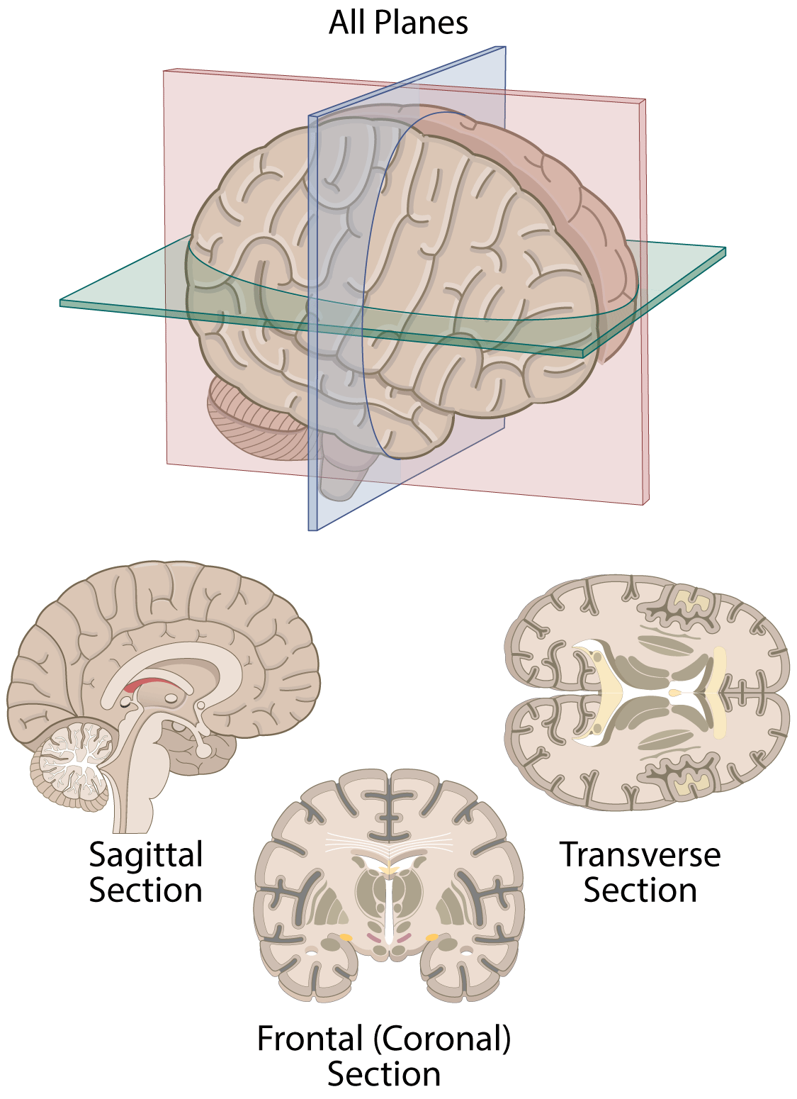 On retrouve trois plans de coupe utilisés dans les images en IRM structurelle, soit les plans axial (transversal) coronal et sagittal. Ce sont différentes façons de sectionner le cerveau qui nous permettent d’observer des structures spécifiques. Le plan axial correspond à un découpage du cerveau du bas vers le haut. Le plan coronal fait référence à des coupes de l’arrière vers l’avant du cerveau. Finalement, le plan sagittal est une façon de diviser le cerveau de la gauche vers la droite.